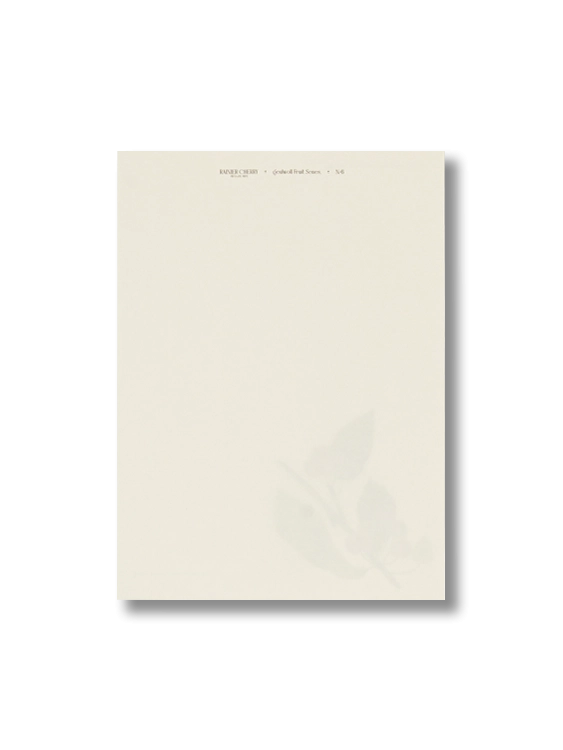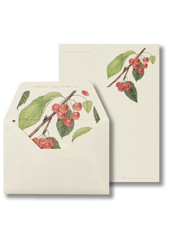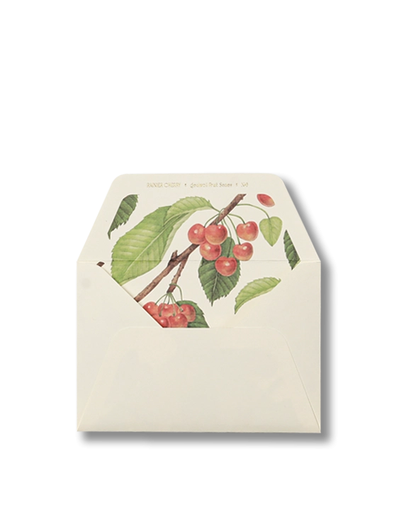 붉은빛을 띠는 레이니어 체리 편지 세트입니다. 워싱턴의 가장 높은 봉우리의 이름을 딴 레이니어 체리는 풍부한 일조량을 바탕으로 달콤한 여름의 맛을 품습니다. 엷은 광택이 도는 열매와 톱니 모양의 나뭇잎이 열리는 체리 나무는 정원을 가꾸는 이에게도 사랑받는 나무입니다. 작고 아름다운 열매를 좋아하는 이에게 추천합니다.